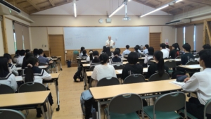 森先生は小学4年生の当時一宮空襲を経験し現在は90歳のご高齢をおして講演してくださりました。90歳とは思えない雰囲気と矍鑠とした語りに一同驚きました。警報が鳴るたびに、学校と家を往復した話。実際に一宮空襲で家族がバラバラになり逃げたが、事前に決めていた場所に家族全員が集まった話などを聴けました。また、戦後の学校の混乱の様子も聞くことができました。先生自身も久しぶりに母校に来た嬉しさか、高校時代の思い出話もたくさん話し てくれました。本当に貴重なお話をありがとうございました。混とんとする現代だからこそ、今回参加した生徒の一人一人の中で何かが変わったと信じています。