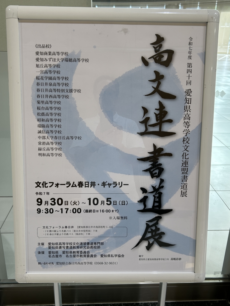 第40回愛知県高等学校文化連盟書道展に出品しました。本校は書道パフォーマンスに力を入れていますが、個人として書の力量を高める目的で作品を外部コンクール等にも応募しており、高文連の書道展への出品も3年連続で行っています。今年は軸装9作品、額装6作品を出しています。