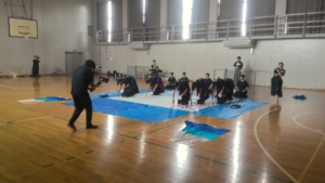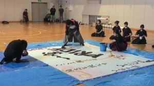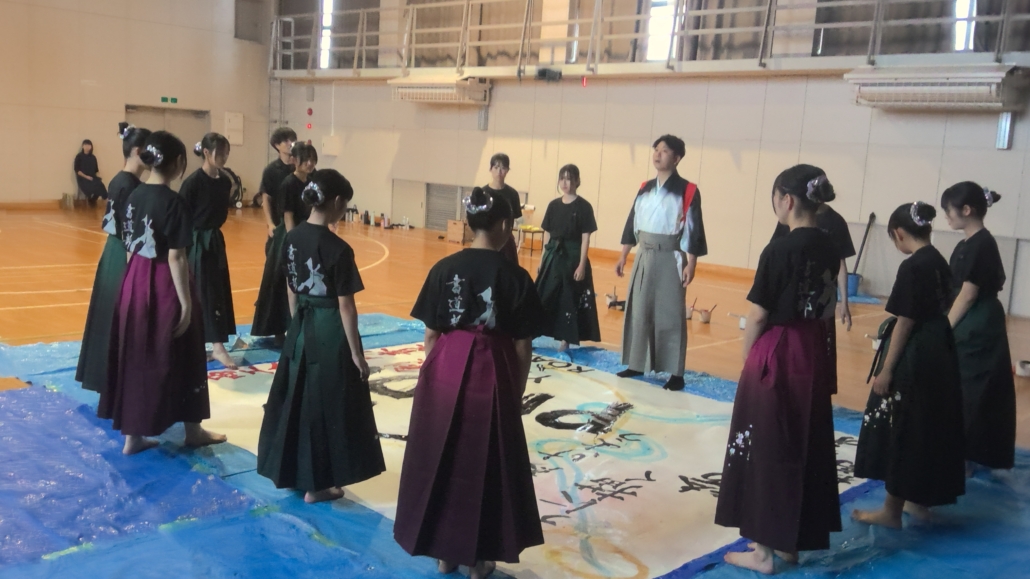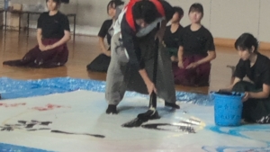 今年、一宮商工会議所青年部が30周年を迎えるということで、その記念式典のオープニングを飾る動画に出演しました。内容は、部員たちが書道パフォーマンスを行っている途中で、青年部会長が登場。大筆を揮ってキャッチフレーズの「一宮PRIDE」と書き込むという趣向でした。撮影は本校体育館で行い、ドローンも駆使して上空からも撮影するという本格的なものとなりました。この日書いた作品は、記念式典当日に会場で披露されるそうです。