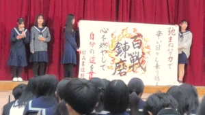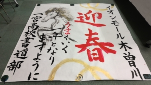 書道部活動報告2026年1月27日/カテゴリ: お知らせ, 書道部 /作成者: HYG-74hyg-41JHY1月26日(月)に予餞会(3年生を送る会)があり、今年も大学受験や卒業を控えた3年生に向けてメッセージの書を披露しました。今年のテーマは「百戦錬磨」。お世話になった2年生部員が書き上げました。一方1年生は、年末年始にイオンモール木曽川で展示された「迎春」の書を作成しました。 https://ichinomiya-h.jp/wp-content/uploads/2023/08/e79f1f6e744301986cb5f066d1b3de85.jpg 153 156 HYG-74hyg-41JHY https://ichinomiya-h.jp/wp-content/uploads/2022/12/ichinomiya_logo340_156b.png HYG-74hyg-41JHY2026-01-27 13:23:292026-01-27 13:23:29書道部活動報告
