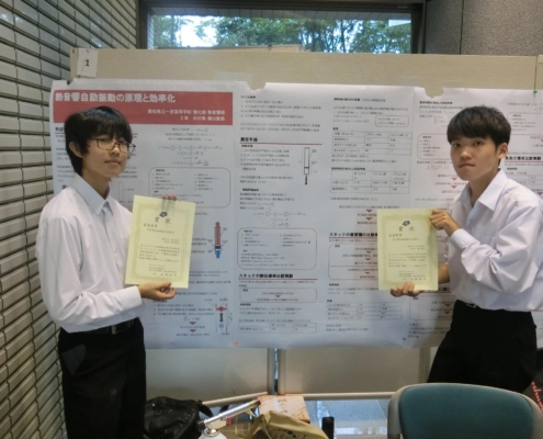 物化部熱音響班(2年生2名)が高校生科学研究室(NIFSオープンキャンパス)に参加し、「熱音響自励振動の効率化」の成果発表をし、最優秀賞を受賞しました。