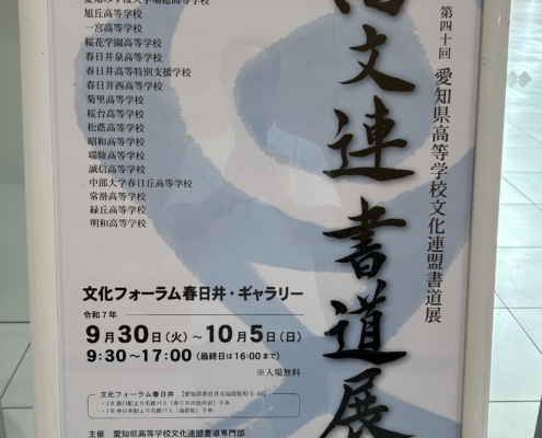 第40回愛知県高等学校文化連盟書道展に出品しました。本校は書道パフォーマンスに力を入れていますが、個人として書の力量を高める目的で作品を外部コンクール等にも応募しており、高文連の書道展への出品も3年連続で行っています。今年は軸装9作品、額装6作品を出しています。